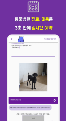 - 의료 서비스 예약 : 언제 어디서나 전국 어디서나 반려동물 진요 예약을 원활하게 할 수 있습니다. 원하는 동물병원과 클리닉을 손끝으로 간편하게 예약할 수 있습니다.
