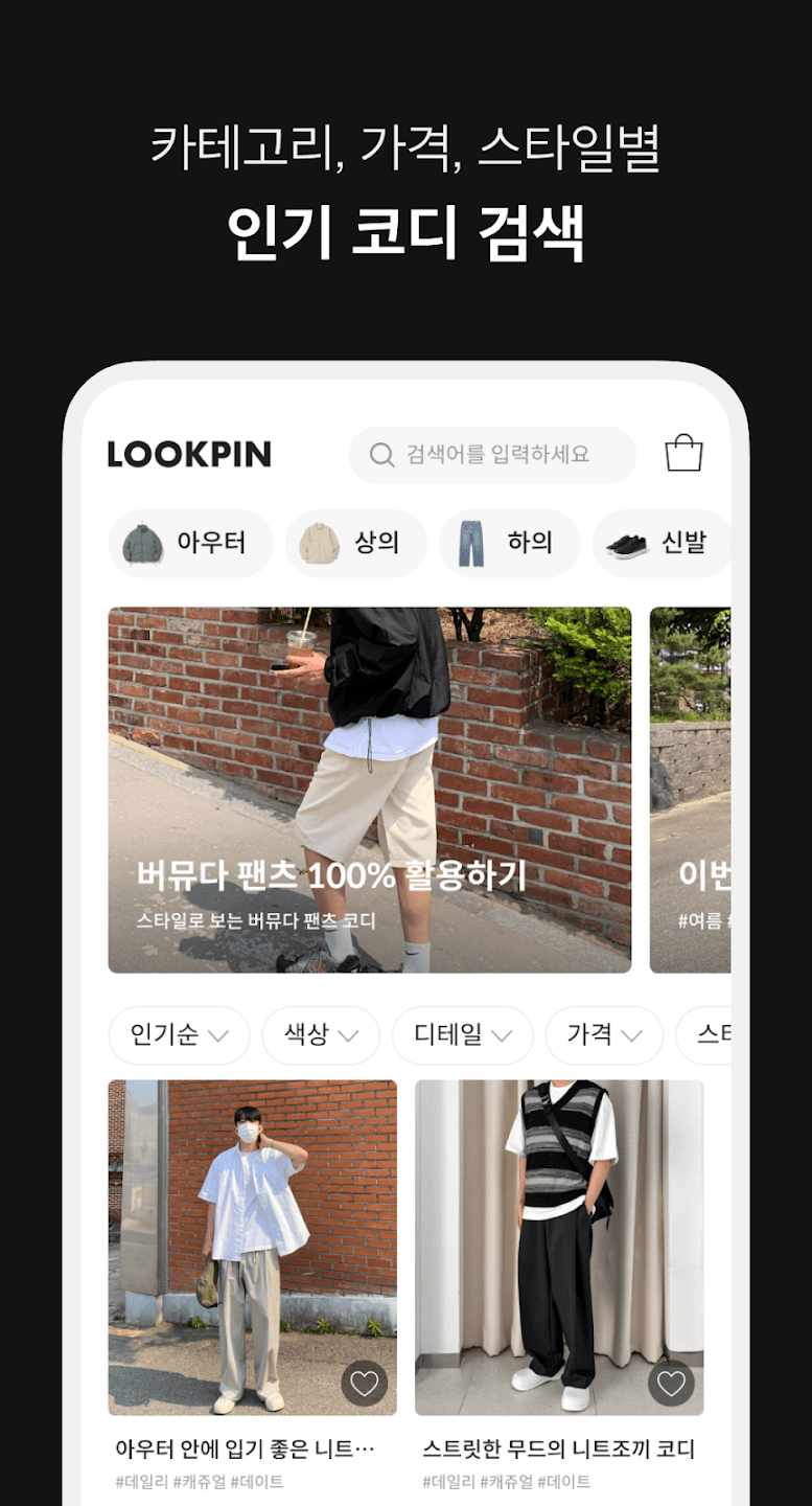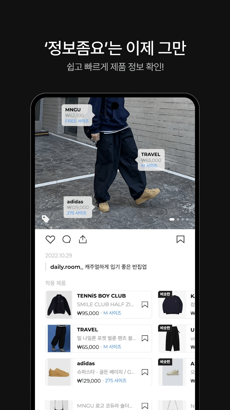 - 디테일인 제품정보 : 매력적인 데일리룩뿐만 아니라 해당 룩에 등장하는 각 아이템의 필수 디테일도 함께 보여줍니다. 클릭 한 번으로 각 제품의 구매처를 찾을 수 있습니다. 손끝하나로 편리하게 확인해 보세요.