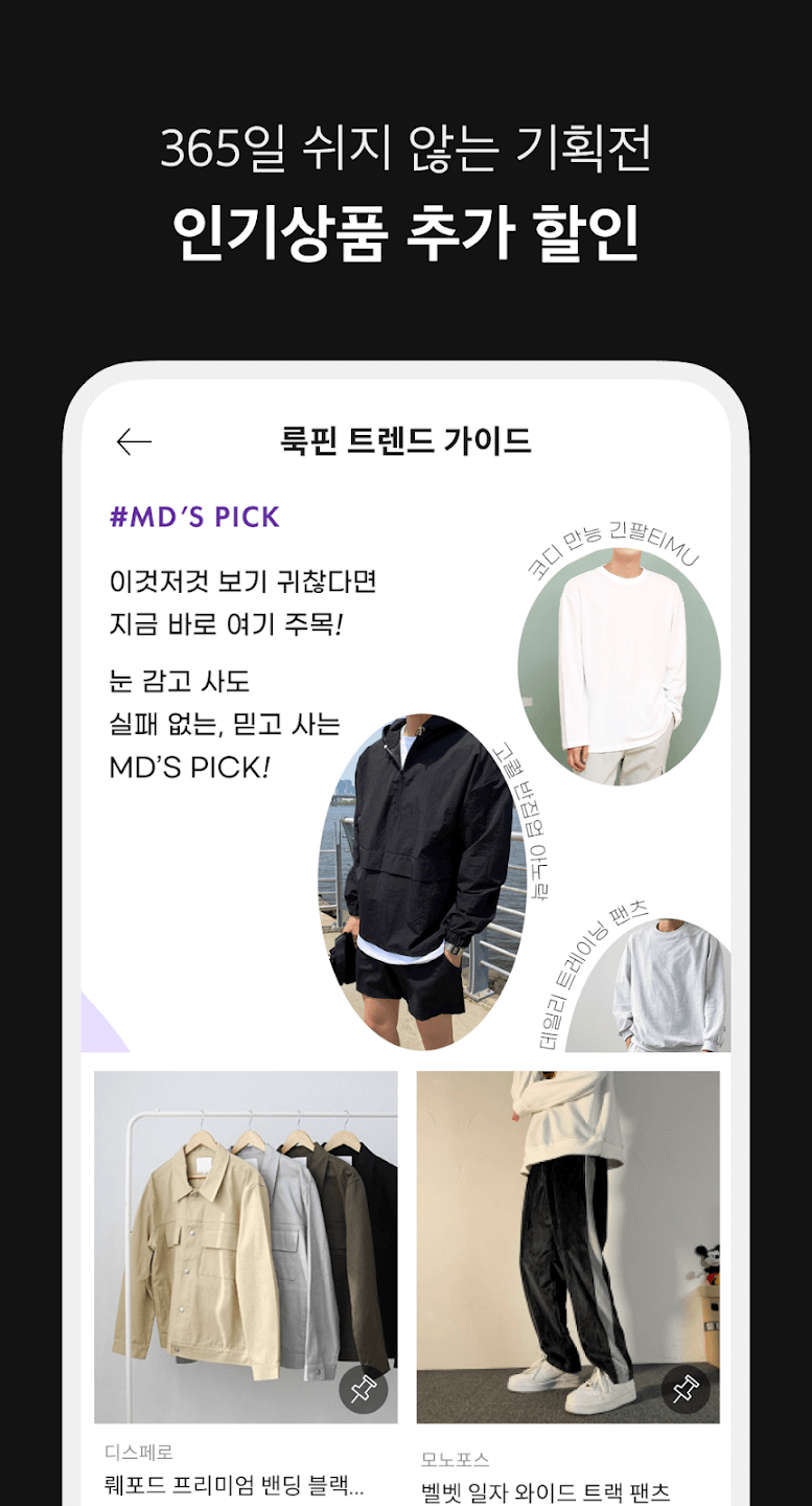 - 연중 세일 : 룩핀에서는 매일 세일 데이입니다! 패션에 관심이 많은 남성분들을 위해 패션계 곳곳에서 엄선한 다양한 한국 의류 컬렉션을 선보입니다.
