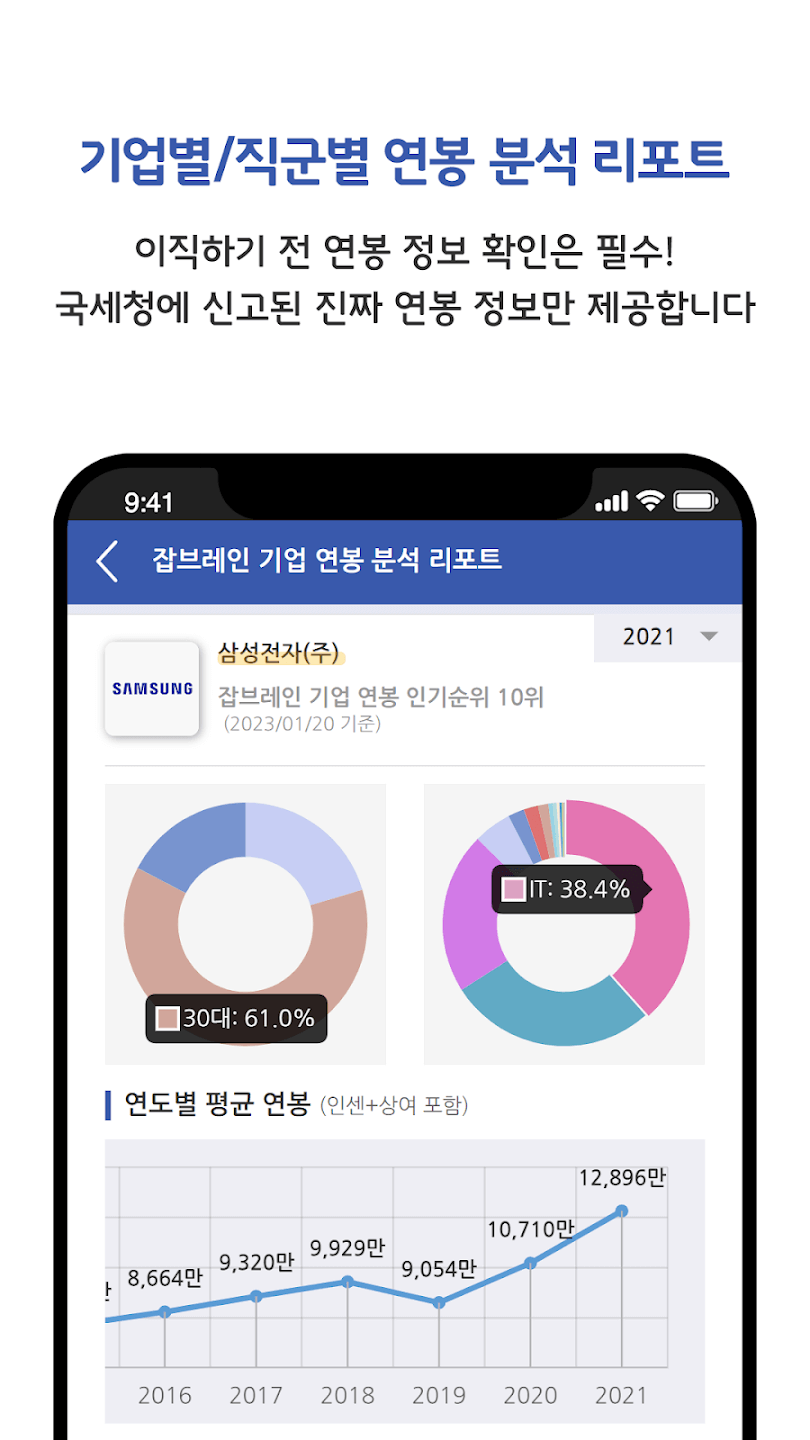 - 회사/직군별 연봉 분석 : 이직 전 연봉 분석 보고서를 통해 다음 이직을 계획하세요. 국세청에 신고된 실제 급여 정보를 제공합니다.