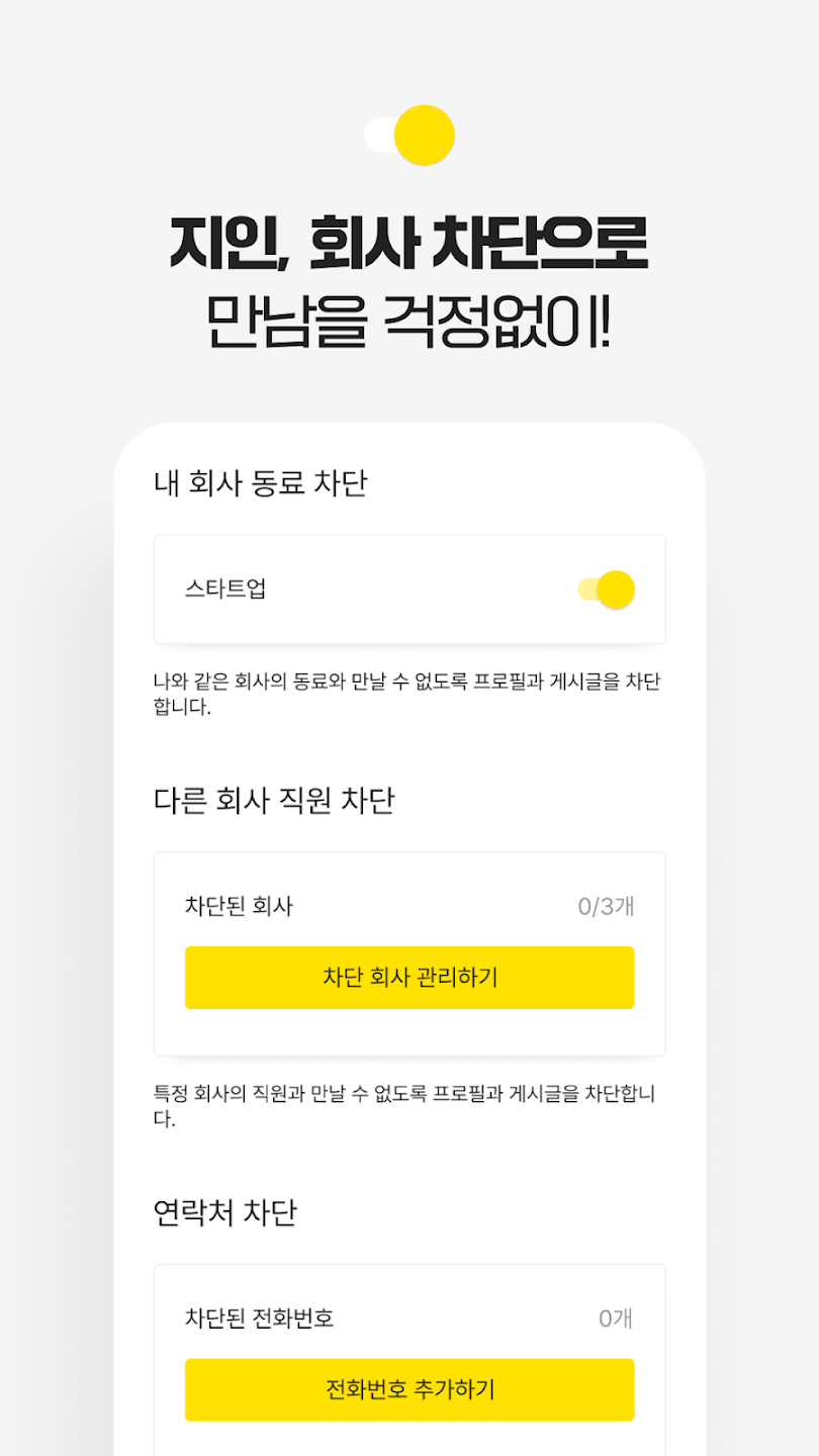 - 저희는 신중함의 필요성을 매우 잘 알고 있습니다. 블릿에서는 현재동료, 전 파트너, 그리고 그들의 회사를 포함하여 만나고 싶지 않은 사람들을 차단할 수 있습니다. 최대 4개의 회사를 차단할 수 있어 피하고 싶은 조직의 구성원에게 노출되지 않도록 할 수 있습니다.
