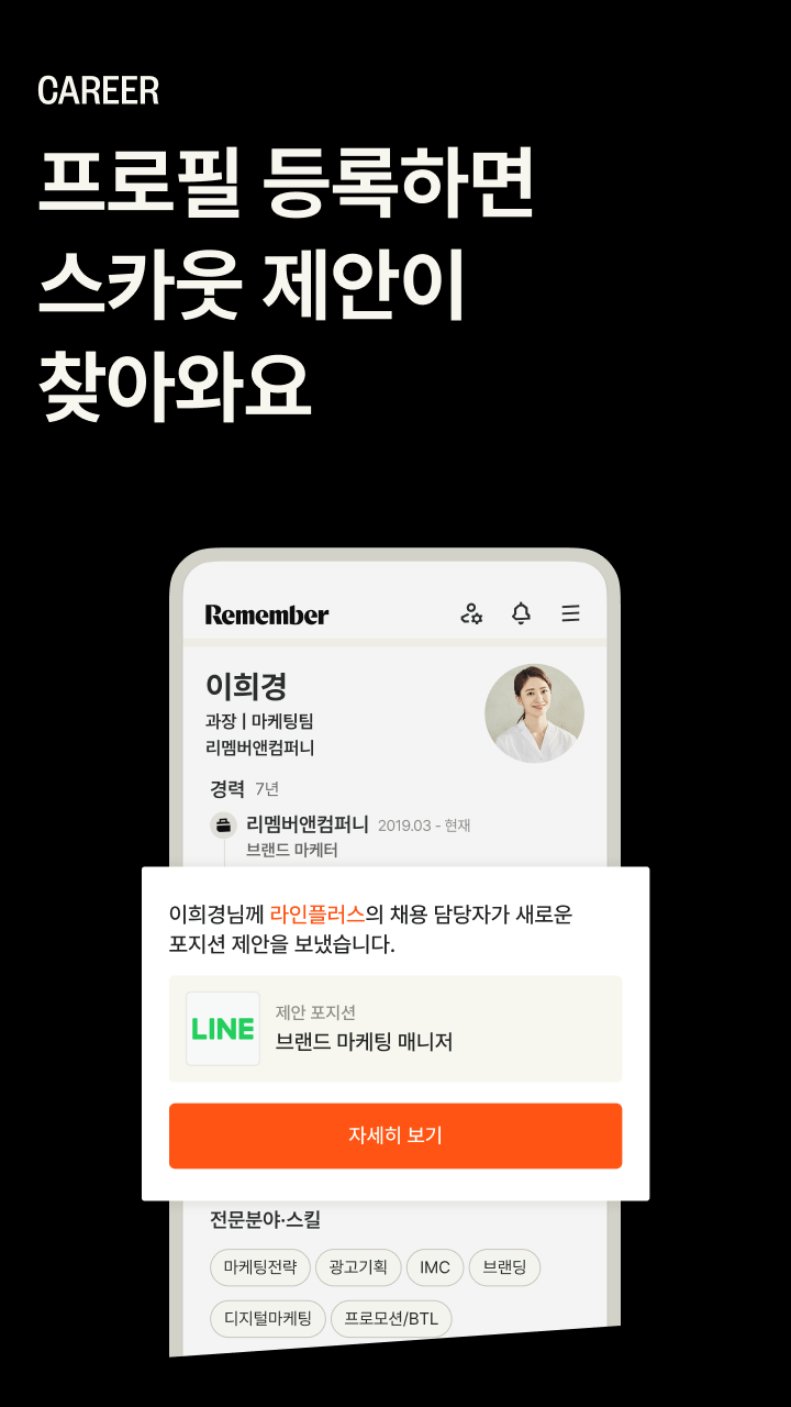 - 커리어에 불을 붙이세요. : 기회를 기다리지 말고 직접 찾아보세요. 리맴버 플랫폼에 프로필과 이력서를 등록하세요. 채용 담담자에게 프로필이 공개되어 직접 채용 제안을 보낼 수 있습니다. 개인정보 보호 기능으로 구직활동을 비공개로 유지할 수 있습니다. 현재 근무 중인 회사에서는 나의 프로필을 볼 수 없습니다.