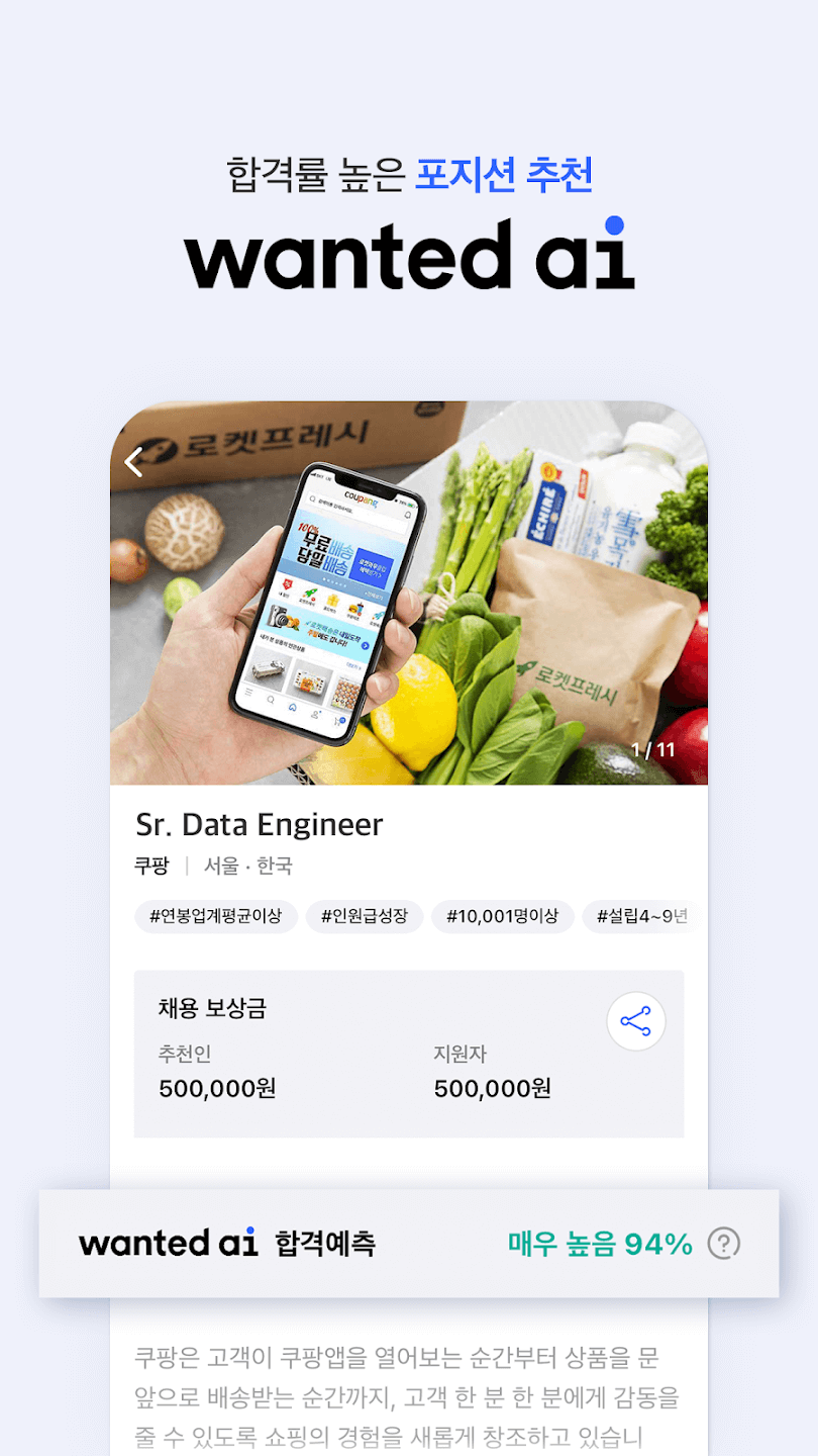 - 개인화된 일자리 추천 : 최첨단 원티드 AI가 표준 매칭률이 4배에 달하는 일자리 추천하여 보다 효율적인고 효과적인 이직 프로세스를 지원합니다.