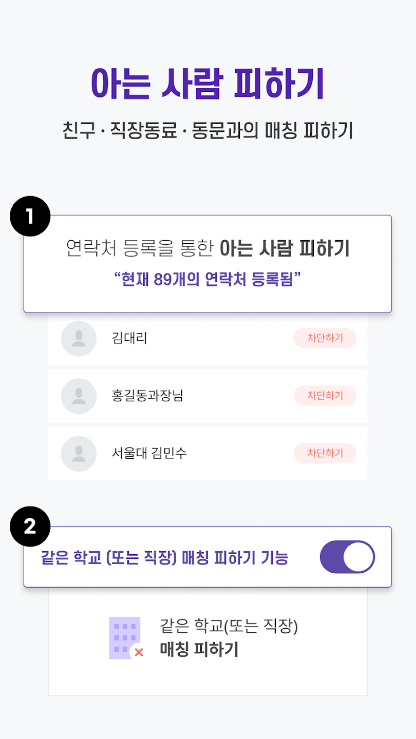 - 4. 지인 회피는 전용 기능을 통해 100% 달성할 수 있습니다.