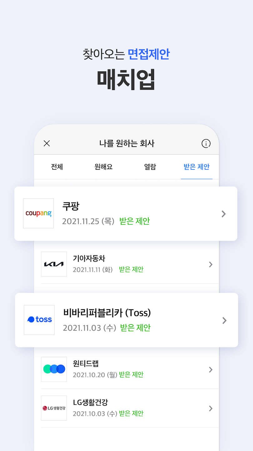 - 프로필 기반 면접 제안 : 프로필은 등록하고 매치업 기능을 통해 면접제안을 받아보세요.