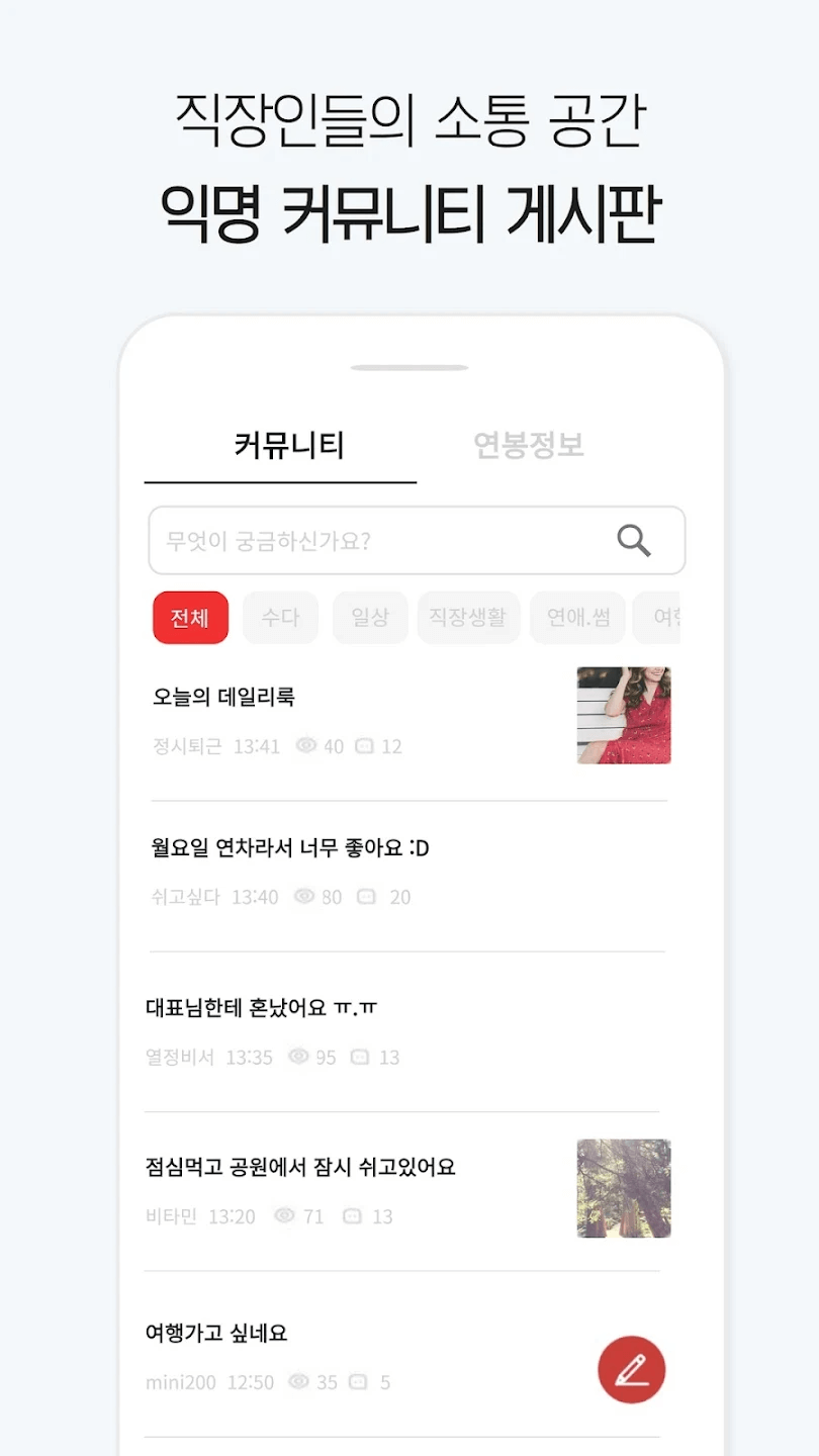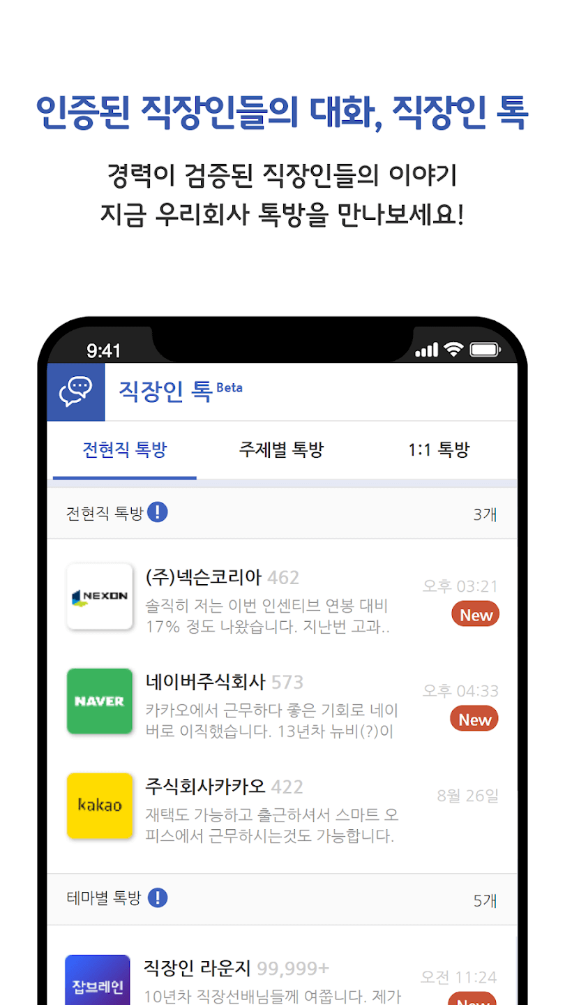 - 주제별 커뮤니티 게시판 : 관심사를 공유하는 직장인들과 유익한 대화를 나누고 싶었던 적이 있나요? 토픽 커뮤니티 게시판을 통해 일상생활이나 업무 관련 주제에 대해 대화를 나눌 수 있습니다. 익명이지만 예의 바른 직장인들과 의미 있는 대화를 나눌 수 있습니다.
