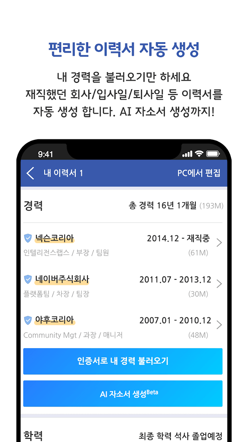 - 자동 이력서 생성 : 자동 이력서 생성기로 입사 지원 절차를 간소화하세요. 고용이력, 시작인과 종료일, 직책등의 정보를 편리하게 입력할 수 있습니다. 심지어 인공지능 커버레터도 생성해 줍니다.
