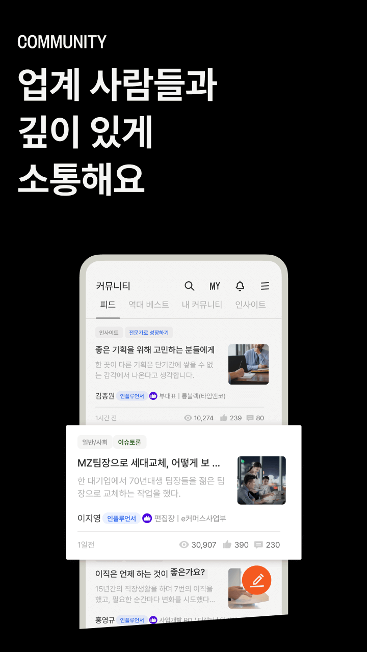 - 활기찬 커뮤니티에 참여하기. : 나와 같은 생각을 가진 업계 전문가들과 소통하세요. 커리어에 대한 고민을 나누고 직장 생활에 대한 인사이트를 얻으세요. 동료 및 업계 베테랑과 함께 업무 관련 문제를 해결하기 위해 활발한 토론에 참여해 보세요.