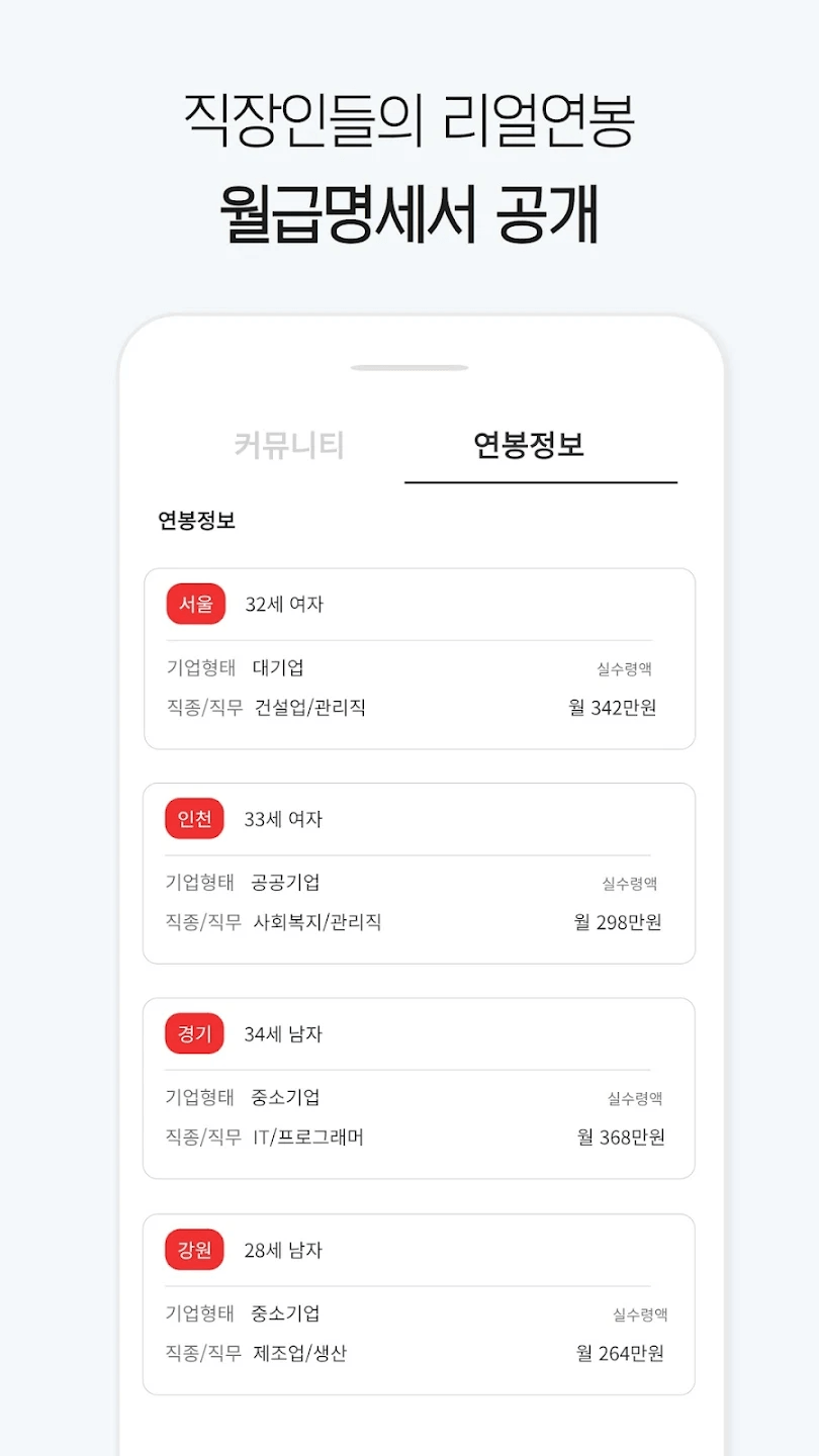 - 직장인 연봉 공개 : 동료 직장인들의 실제 연봉이 궁금한 적이 있나요? 급여 공개 기능을 통해 그 비밀을 확인해 보세요. 직장인들이 직접 게시한 연봉 정보를 통해 인사이트를 얻을 수 있습니다.