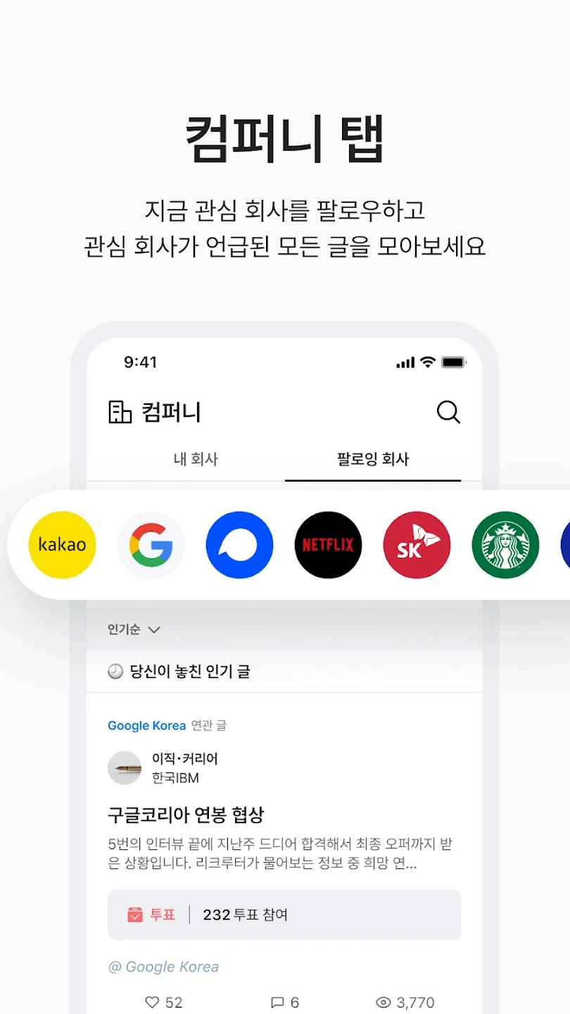 - 관심회사 팔로우 : 관심 있는 기업을 주시할 수도 있습니다. 특정 조직을 팔로우하면 해당 조직과 관련된 모든 기사와 토론에 참여할 수 있습니다. 팔로우하는 회사의 현직 직원이 작성한 내부자 리뷰와 채용 소식 등 향후 출시 예정인 기능도 기대해 주세요.
