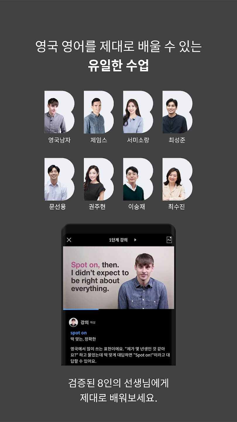 - 브릿 코스의 장점 : 이 과정은 BBC와 공식 계약 덕분에 엄선된 7개의 BBC드라마 전편 비디오를 제공해 드립니다. 또한 학습자는 검증된 6명의 강사가 세심하게 가르치는 혜택을 누릴 수 있습니다. 이 과정에는 최대 6개의 특허가 등록/출원된 특허 코칭 프로그램도 포함되어 있어 독특하고 효과적인 학습 접근 방식을 보장합니다.