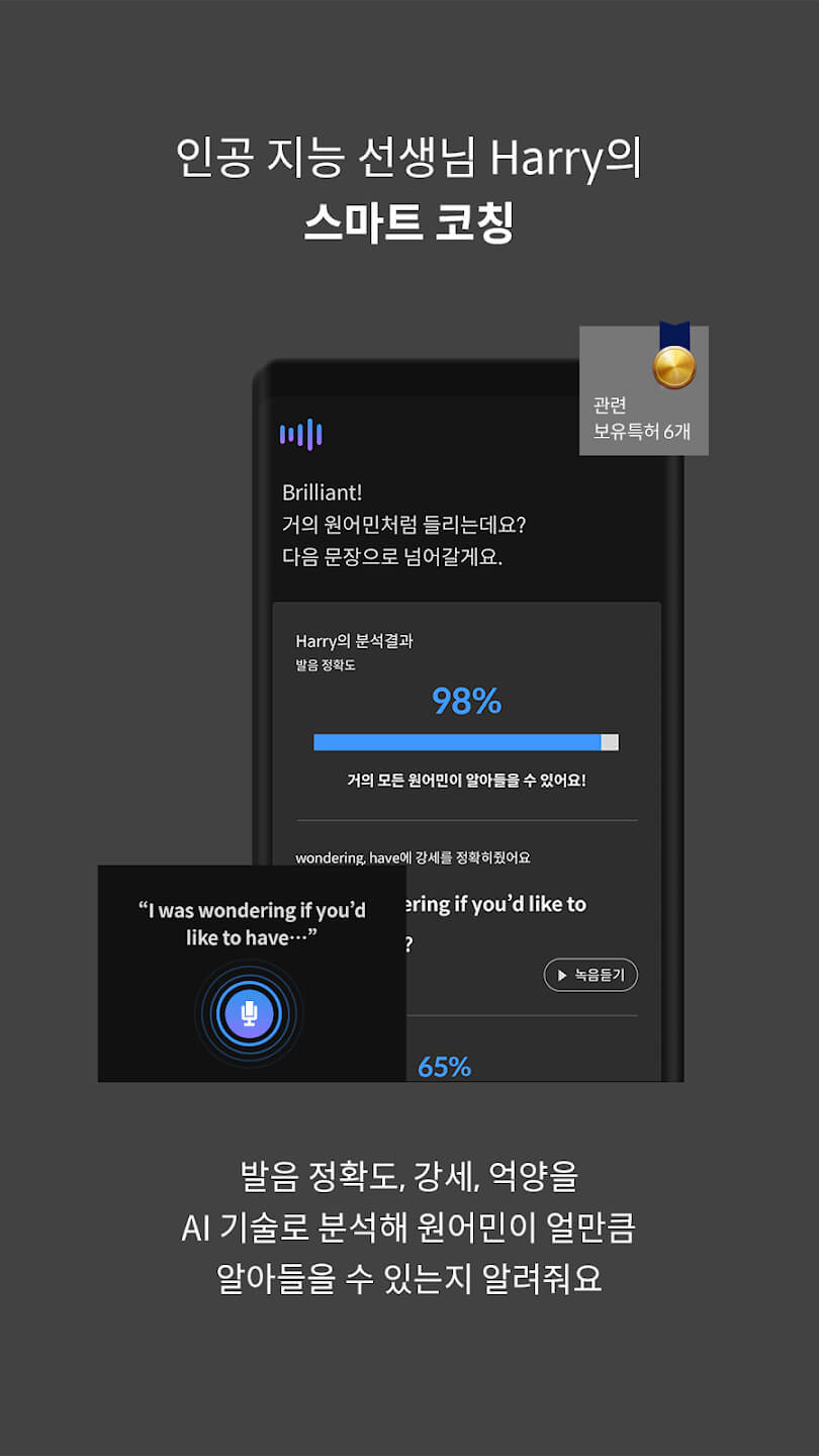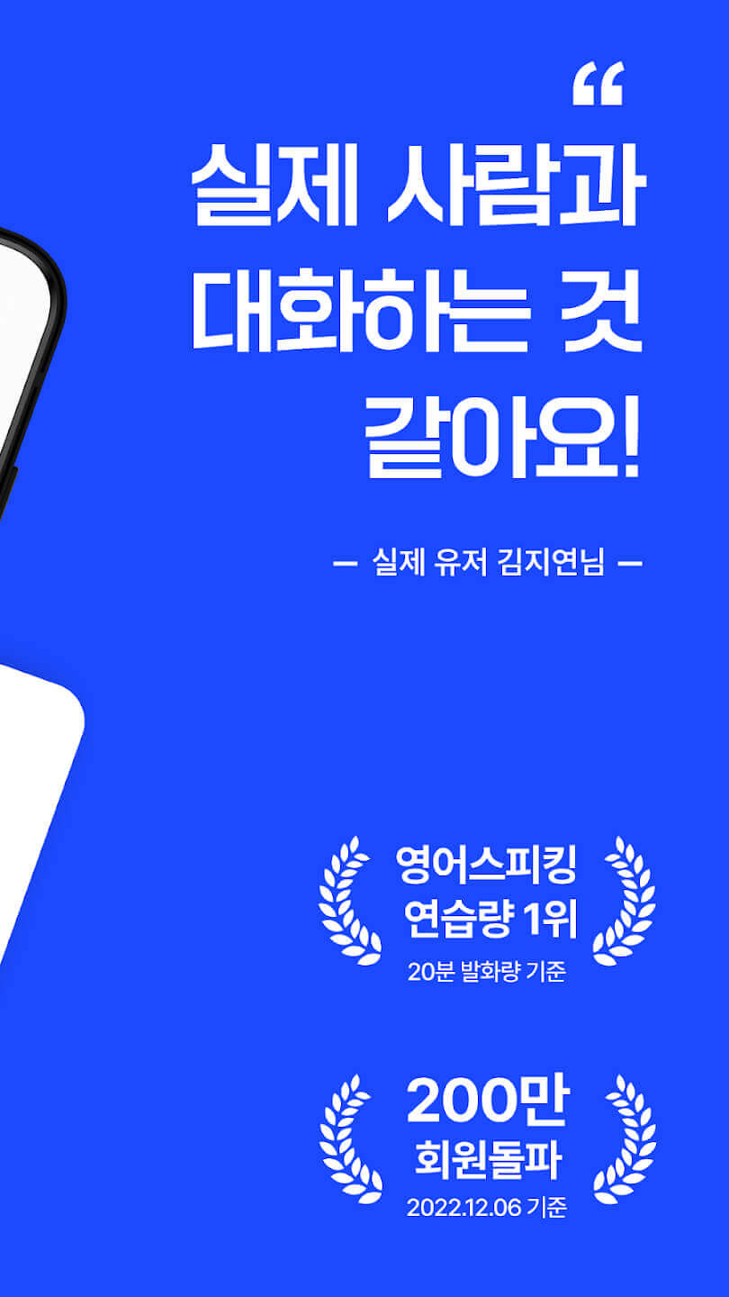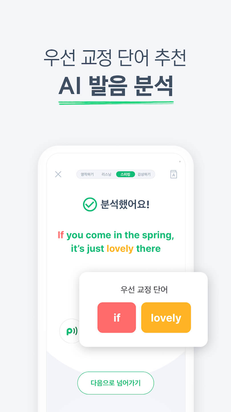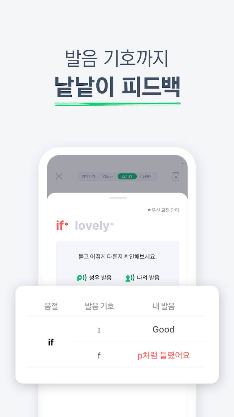 - 명확한 의사소통을 위한 AI의 역할 : 고급 AI기술을 사용하여 명확하고 정확한 영어 의사소통을 도와줍니다. 라인별 비디오 재생 기능을 사용하여 듣고 복습하세요. AI의 정확한 발음평가로 말하기 실력을 다듬을 수 있습니다. 원어민과 대화하는 것처럼 말하기 연습을 할 수 있습니다.