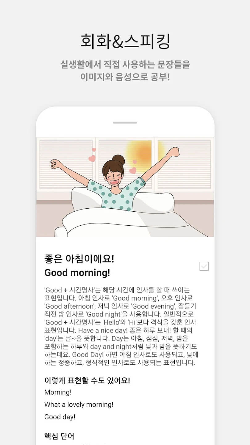 - 실생활에 필요한 영어 : 영어 전문가들이 실생활에 실용적인 콘텐츠를 엄선하여 제공합니다. 배운 문장으로 말하기 연습을 하고 반복되는 퀴즈를 통해 나의 지식을 테스트하세요. 콘텐츠와 상호작용하고 퀴즈를 풀면서 자연스러운 문장 구성과 명확한 표현력을 기를 수 있습니다.