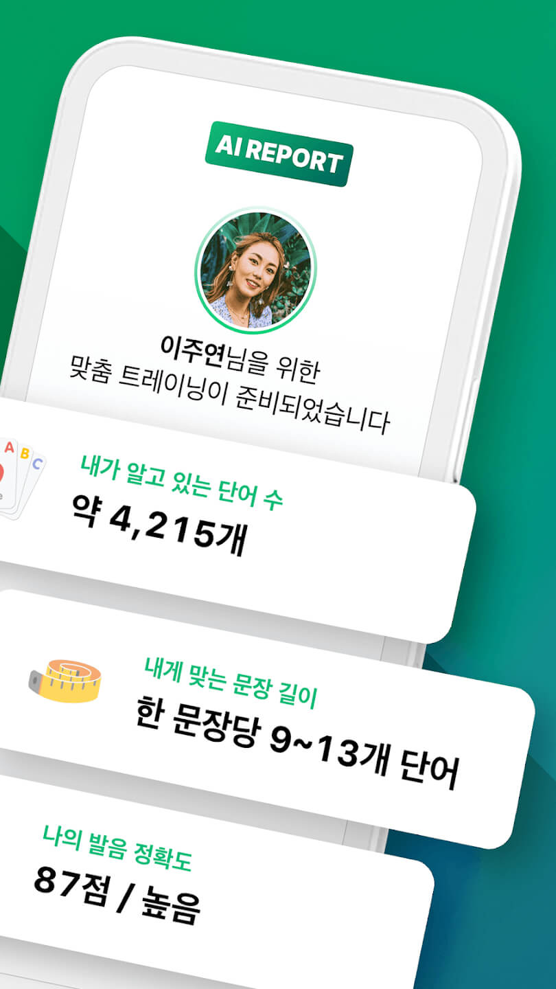 - AI기반 복습 시스템 : 연습이 완벽을 만든다는 것을 기억하세요! 영어를 유창하게 구사하고 싶다면 배운 문장을 잊지 않는 것이 중요합니다. 저의 AI 시스템은 여러분이 배운문장이 영어 구사력의 일부가 될 때까지 부지런히 복습을 해드립니다.