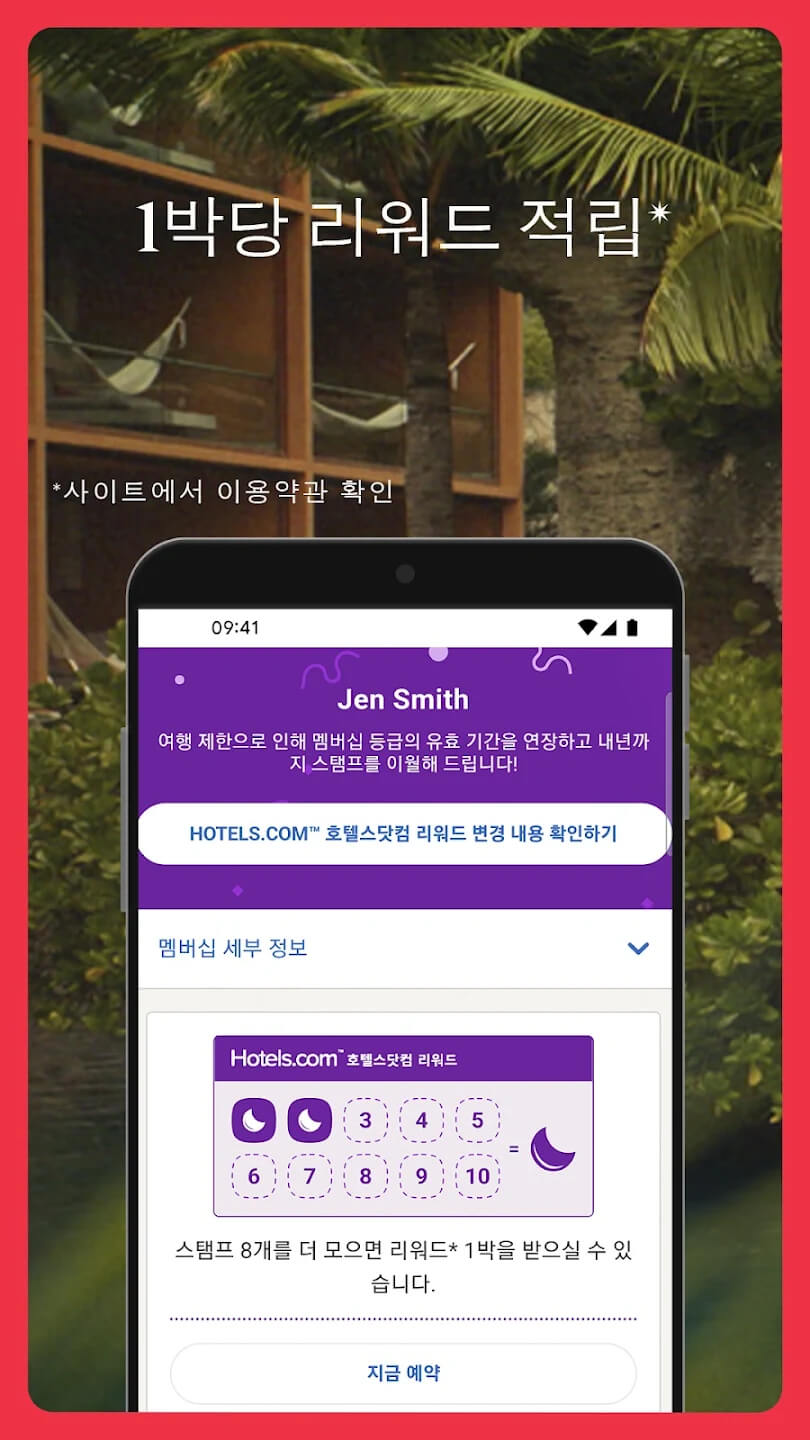 호텔스닷컴 앱으로 특별한 혜택을 경험해 보세요. 호텔스닷컴 리워드 회원은 앱 전용 혜택을 누리고, 더 빠르게 리워드를 적립하며, 놓치지 않고 혜택을 받을 수 있습니다. 호텔스닷컴 앱을 든든한 여행 동반자로 삼으세요. 앱을 통해 예약하고 멤버십 확인 만으로 수천 개의 전 세계 호텔에서 평균적으로 15% 할인 혜택을 누리세요. 블랙아웃날짜를 피라고 대부분 호텔이 제공하는 유연성을 즐겨보세요.