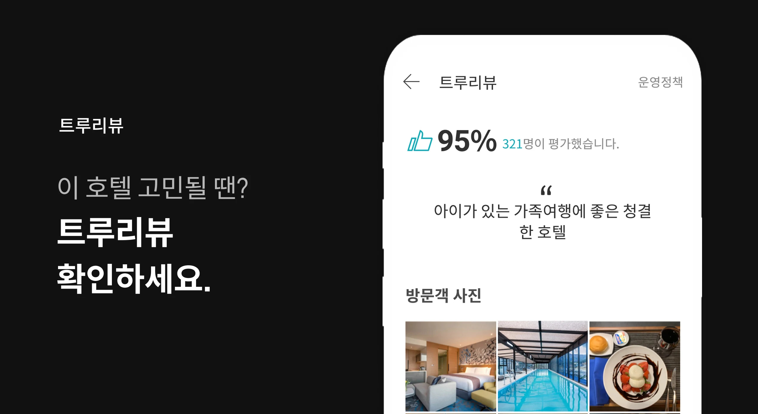 완벽한 여행을 위해 데일리호텔을 믿으세요! 연중무휴 24시간 고객 서비스를 통해 번거오룸 없는 여행을 보장해 드립니다.'데일리 트루 리뷰'를 통해 게스트의 생생한 후기를 확인할 수 있으며, '데일리 트루 VR'을 통해 선택한 숙소를 260도로 미리 만나 볼 수 있습니다.