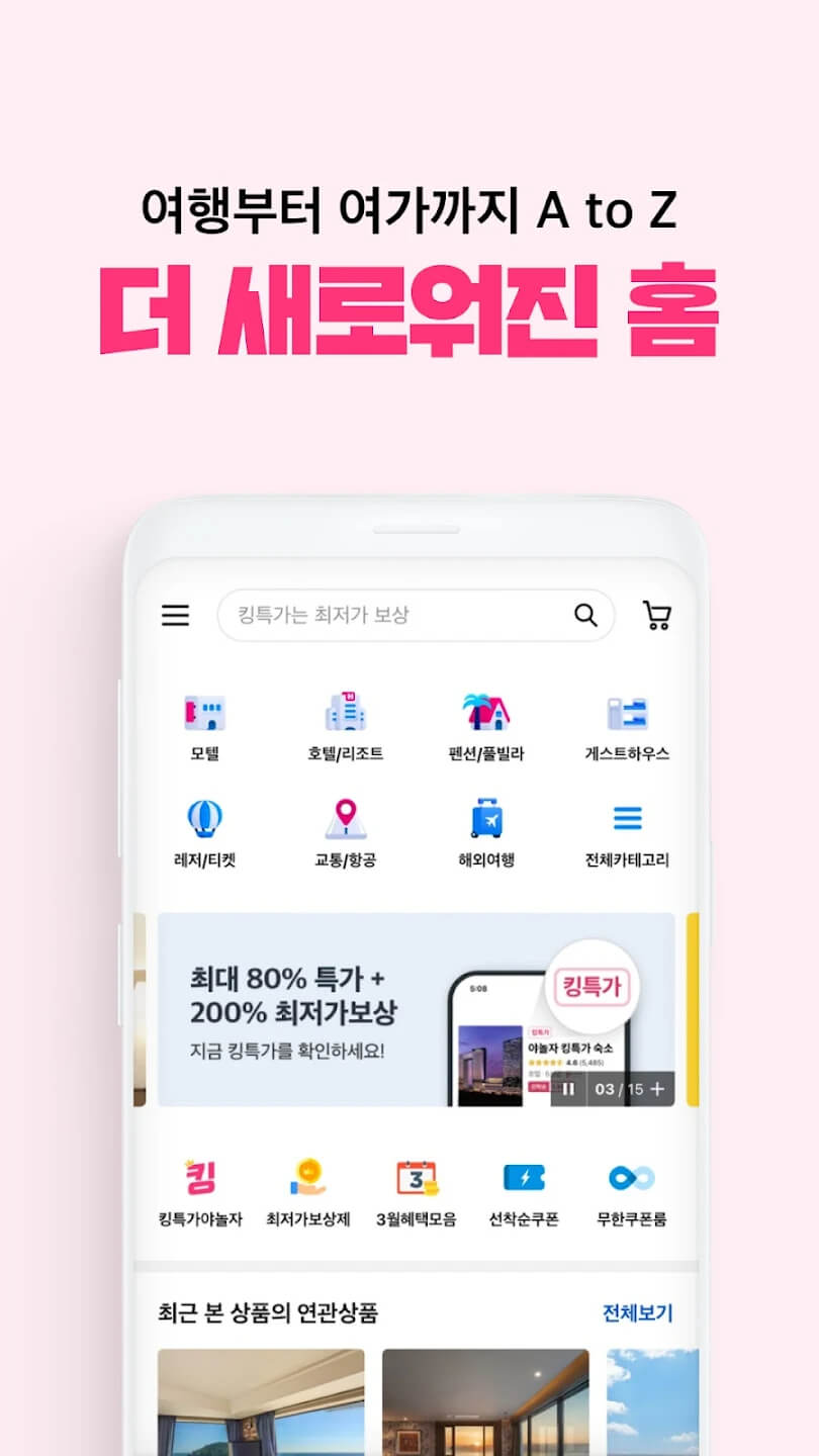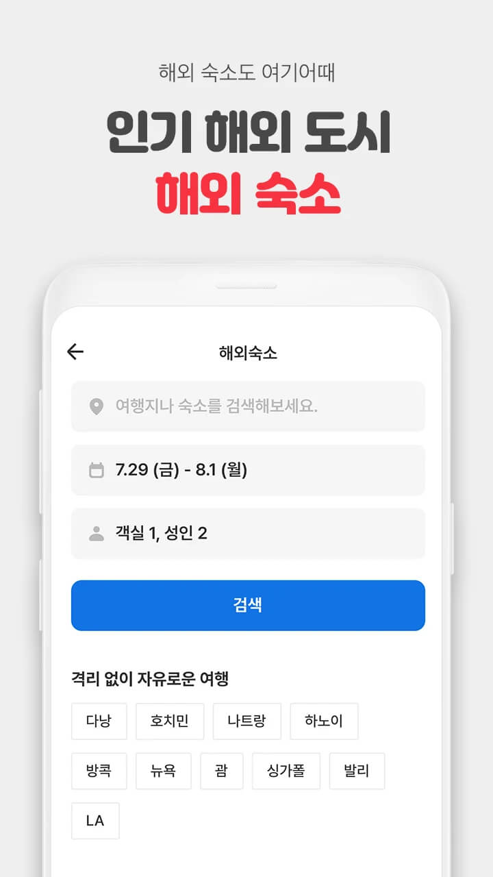 여행과 숙박에 관한 최고의 상품을 찾고 계신가요? 도시별 추가 할인과 주간 최저가 챌린지를 통해 해외여행을 최대 70%까지 할인받으세요. 엄선된 해외 항공권 및 숙박에 대한 특별 혜택을 누려보세요 전국을 모텔, 호텔, 게스트하우스, 전문 레스토랑 예약 시 특별 할인을 받으세요. 신규 회원에게는 추가 할인 패키지가 제공됩니다.