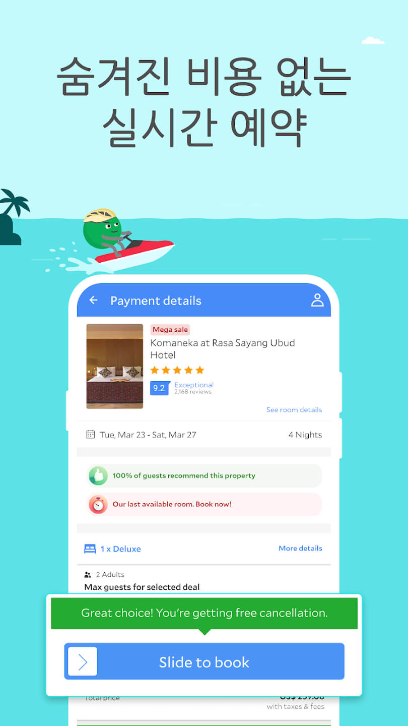 특별혜택, 무료 취소 및 예약 또는 신용카드 수수료 없이 편리하게 예약하세요. 40개 이상의 언어로 24시간 만족 스러 온 고객 서비스를 경험해 보세요. 언제 어디서나 예약을 관리하며, 번거로움 없는 여행을 즐겨보세요.