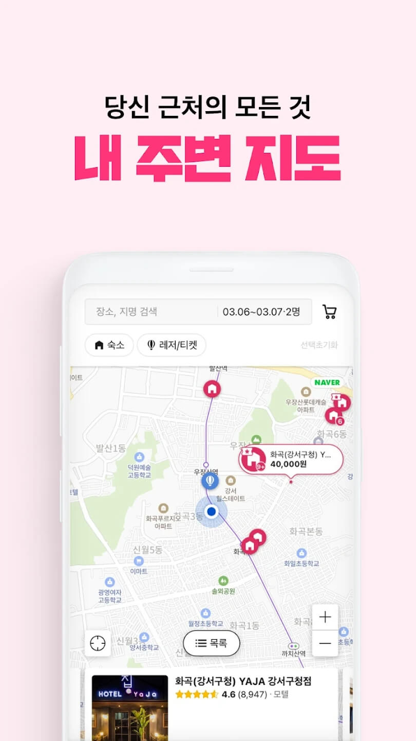 국내 대표 숙박 앱, 야놀자와 함께 최고의 휴가지에서 여유를 느껴보세요. 호텔, 모텔, 게스트 하우스 등 45,000여 개의 독특한 숙소를 이용할 수 있습니다. 넓은 객실은 90일 전에 미리 예약하고, 천만 사용자 커뮤니티의 생생한 후기를 읽어보세요.