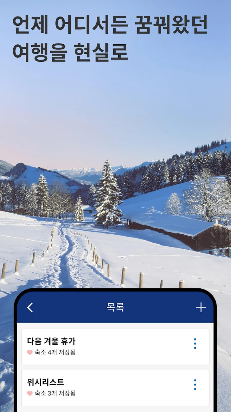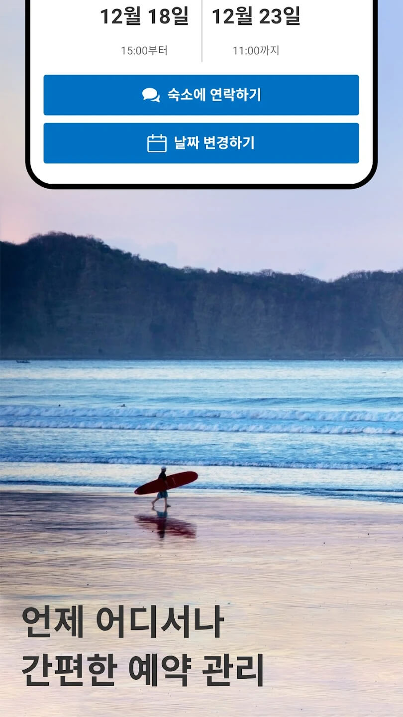 휴가용 주택, 리조트, 아파트 등 다양한 숙소를 둘러보세요. 여행에 필요한 테마별로 필터링하고 지도에서 위치를 확인하세요. 실제 고객 후기를 읽고 마음에 드는 장소를 저장하세요. 안전하고 빠른 예약을 경험하세요. 지금 결제 또는 나중에 결제옵션을 선택하고, 결제 세부정보를 저장하여 나중에 더 빠르게 예약할 수 있으며, 애플페이를 사용하여 편리하게 결제할 수 있습니다.