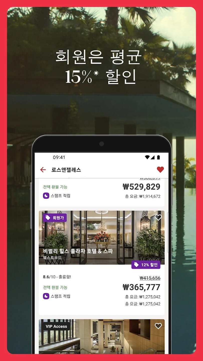 호텔스닷컴 앱으로 특별한 혜택을 경험해 보세요. 호텔스닷컴 리워드 회원은 앱 전용 혜택을 누리고, 더 빠르게 리워드를 적립하며, 놓치지 않고 혜택을 받을 수 있습니다. 호텔스닷컴 앱을 든든한 여행 동반자로 삼으세요. 앱을 통해 예약하고 멤버십 확인 만으로 수천 개의 전 세계 호텔에서 평균적으로 15% 할인 혜택을 누리세요. 블랙아웃날짜를 피라고 대부분 호텔이 제공하는 유연성을 즐겨보세요.