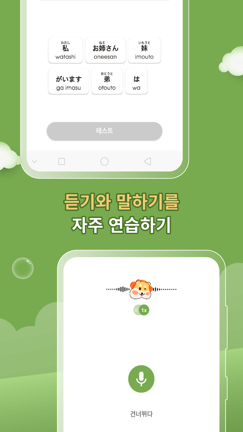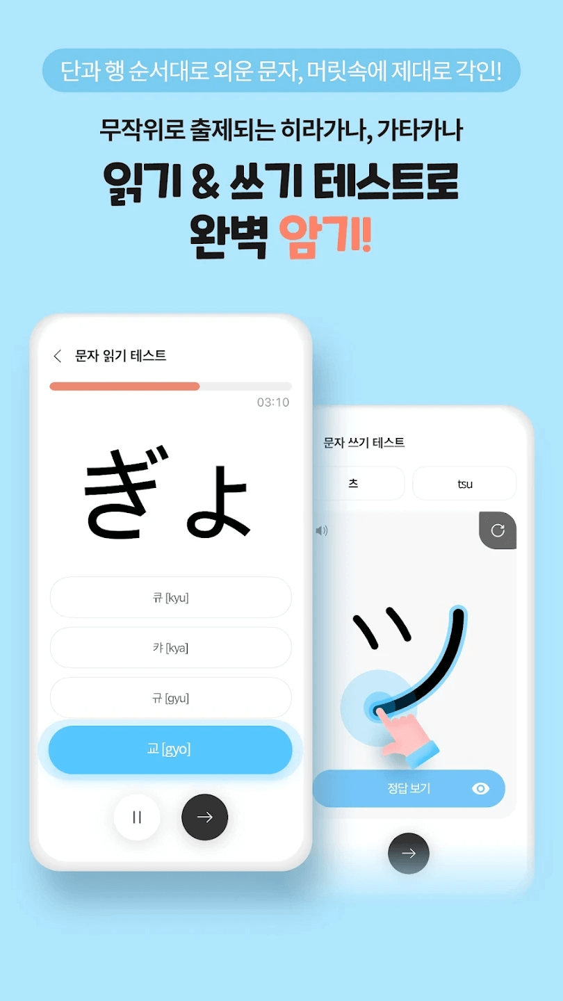 - 원어민의 말을 듣고 직접 문자를 쓰면서 히라가나와 가타카나를 배울 수 있습니다.
