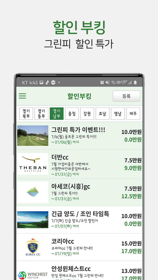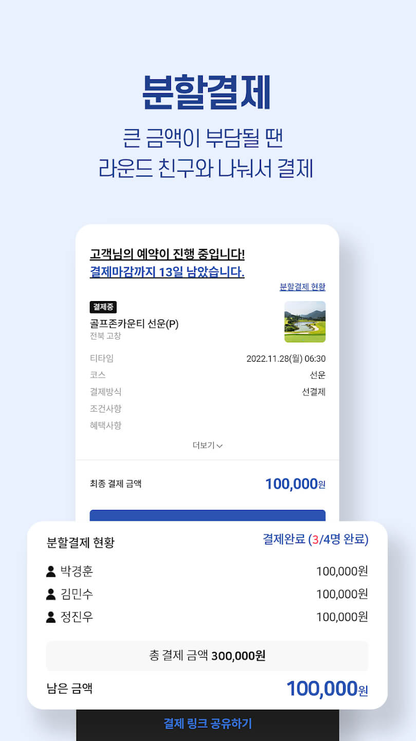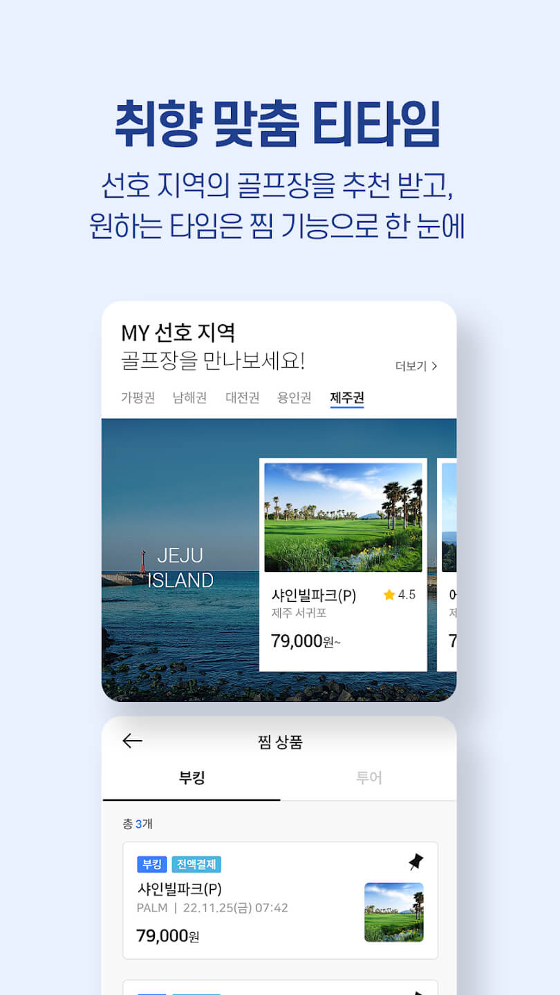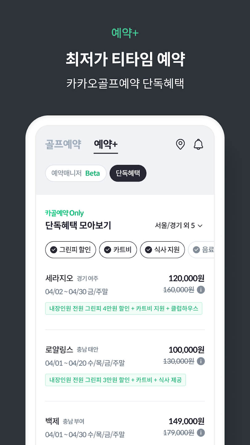 - 카카오 골프만의 특별한 혜택 : 카카오 골프에서만 예약할 수 있는 최고의 티타임 혜택을 만나보세요. 그린피 할인, 카트비 지원, 식음료 및 선물결제 등의 추가 혜택을 누려보세요.