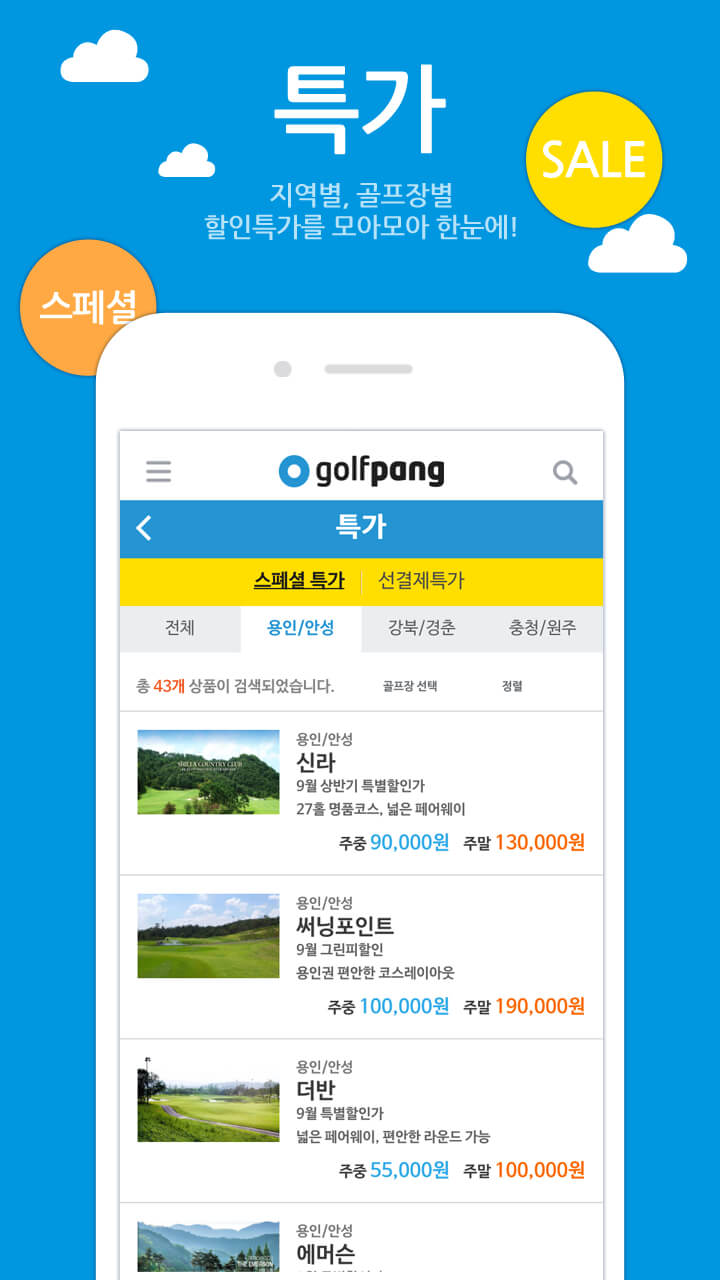 - 다양한 지역으로 제안 : 골팡을 이용하면 한강 이남, 강북/경춘, 충청/원주 지역의 골프장을 저렴한 그린피로 이용할 수 있습니다. 또한 강원, 충청, 영남, 호남, 제주 지역의 골프 패키지 및 해외 골프 투어도 제공하고 있습니다.