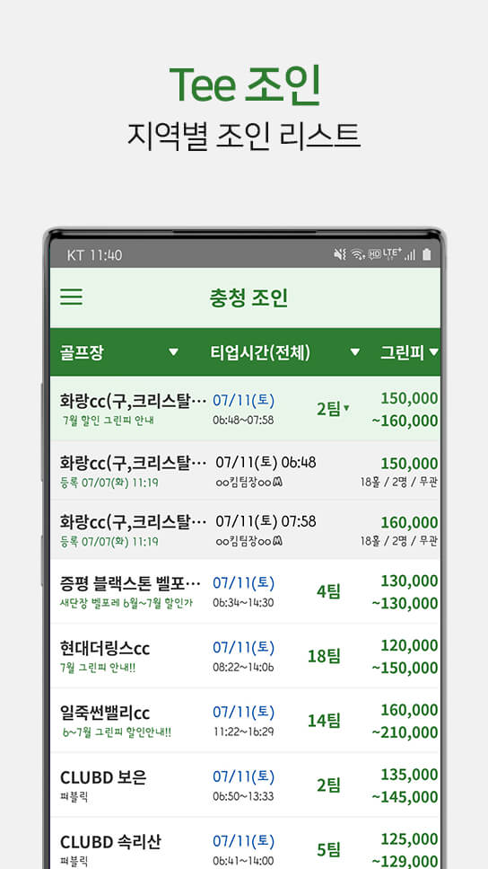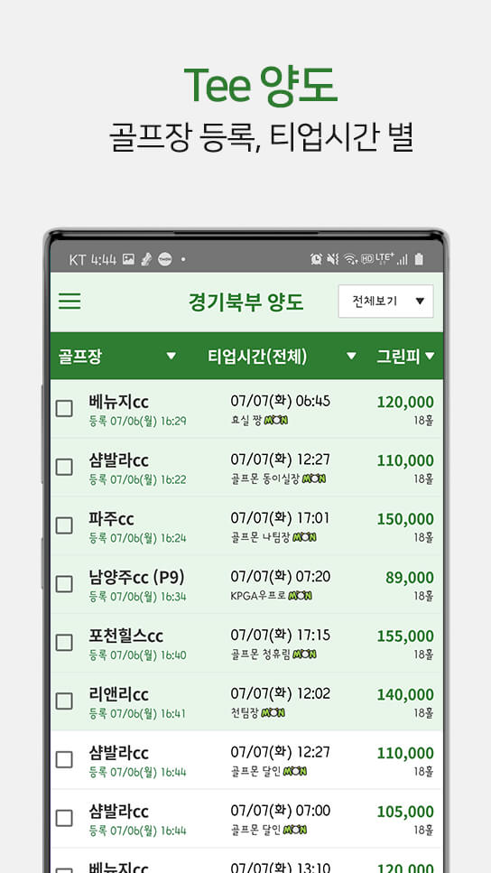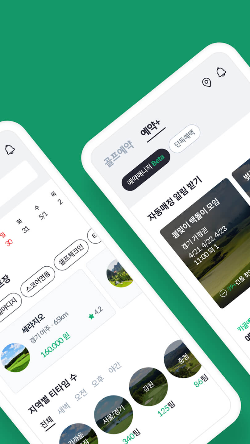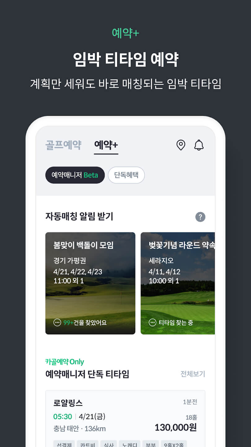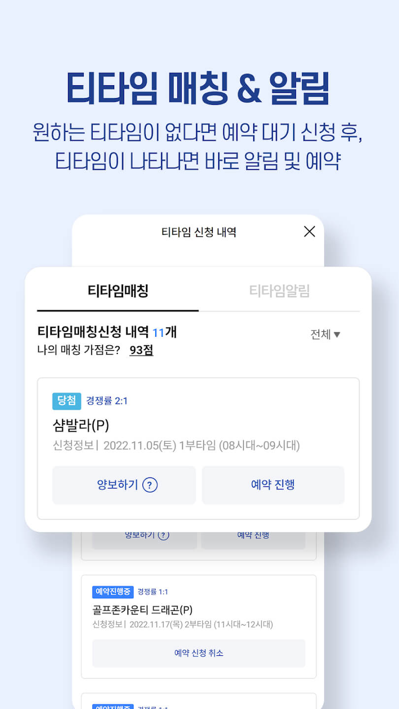 - 효율적인 예약 관리 : 간편한 티타임 예약 및 등록 관리, 등록한 선호도에 따라 자동으로 티타임 매치 알림을 받습니다. 새로운 티타임에 대한 푸시 알림.