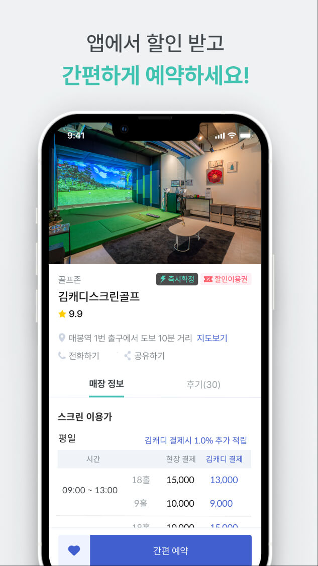 - 사용자 편의를 위한 김캐디 앱의 지원 : 골퍼들의 편의를 위해 끊임없이 노력하고 있습니다. 전국 약 9,000개의 스크린 골프장과 골프연습장을 등록했으며, 정기적으로 더 많은 골프장을 추가하고 있습니다. 스크린 골프장과 제휴를 통해 저렴한 가격으로 스크린 골프 라운딩을 즐길 수 있으며, 다양한 시뮬레이터 브랜드의 편리한 예약 기능도 제공합니다.