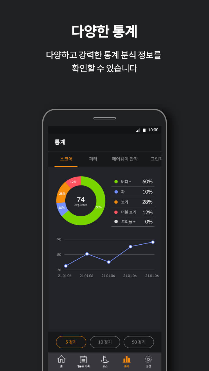 - 개인 기록의 그래픽 표현 :골프버디는 개인 기록을 쉽게 이해하고 해석할 수 있도록 시각적으로 직관적인 그래픽 표현을 제공합니다. 라운드 별로 통계를 표시하여 시간에 따른 골프 실력의 성장과 변동의 추세를 직관적으로 확인할 수 있습니다.