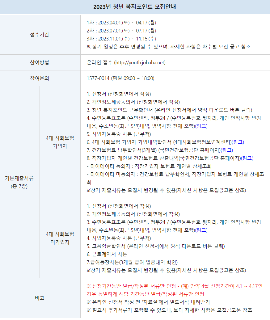 안녕하세요 오늘은 경기도 청년 복지포인트 지원에 대하여 내용을 설명드리겠습니다. 경기도에서 매년 지원하는 청년 복지지원 프로그램이 몇 가지가 있습니다. 그중 인기 있는 지원정책이 경기도 복지 포인트입니다. 2023년 1차 신청 모집이 시작되었기에 알려드리려고 합니다. 그럼 신청자격 대상과 필요한 서류를 설명드리겠습니다.