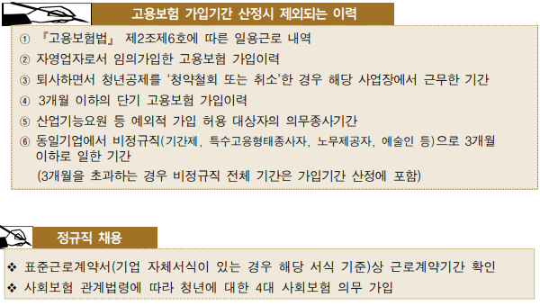 - 최종학교 졸업(이수 또는 수료) 후 고용보험 총 가입기간이 12개월 이하인 자(아래 항목의 고용보험 가입 기간 산정 시 제외)