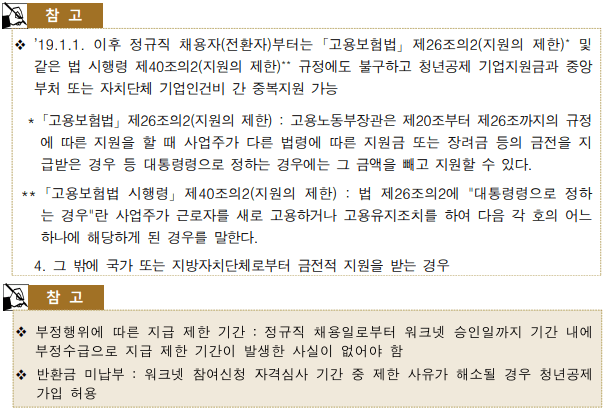 - 「고용보험법 시행령」 제40조(지원금 등의 상호조정)에 따라 지원이 제한되는 기업.(사업주)