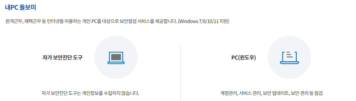 - 내 PC 돌보미 보안점검은 자가 보안진단도구 다운로드 또는 PC알약을 통하여 이용이 가능합니다.