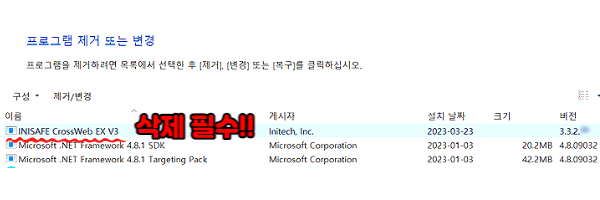 • [제어판]-[프로그램]-[프로그램 및 기능]에서 INISAFE CrossWeb EX V3 버전 확인 후 제거 클릭